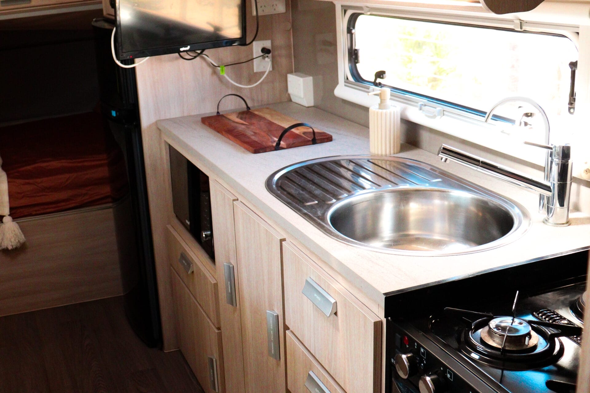 Every camper in our fleet comes kitted out with a comprehensive list of essentials to make your trip as comfortable as possible. You’ll find a fully stocked kitchen, complete with cutlery, cooking supplies, and a fridge/freezer.